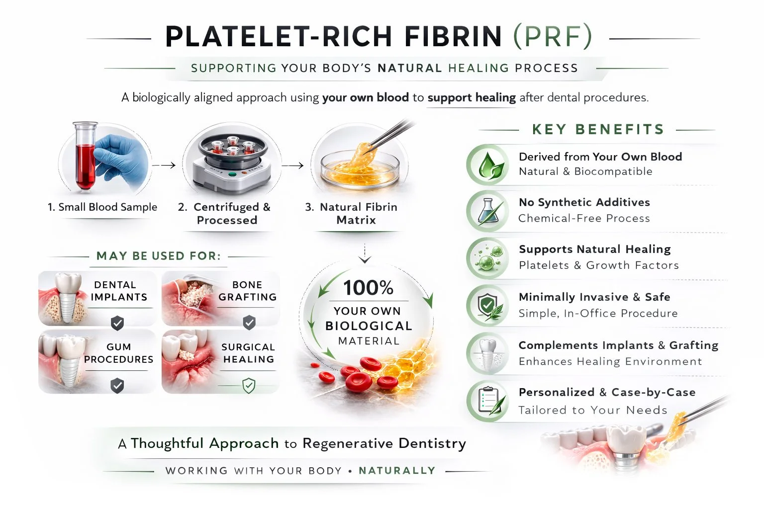 Platelet-Rich Fibrin, often referred to as PRF, is a regenerative approach that uses elements from your own blood as part of certain dental procedures. Rather than introducing synthetic additives, PRF focuses on supporting the body’s natural healing environment. It may be discussed as an option during treatments such as implant placement, gum procedures, or surgical recovery, depending on individual needs.
